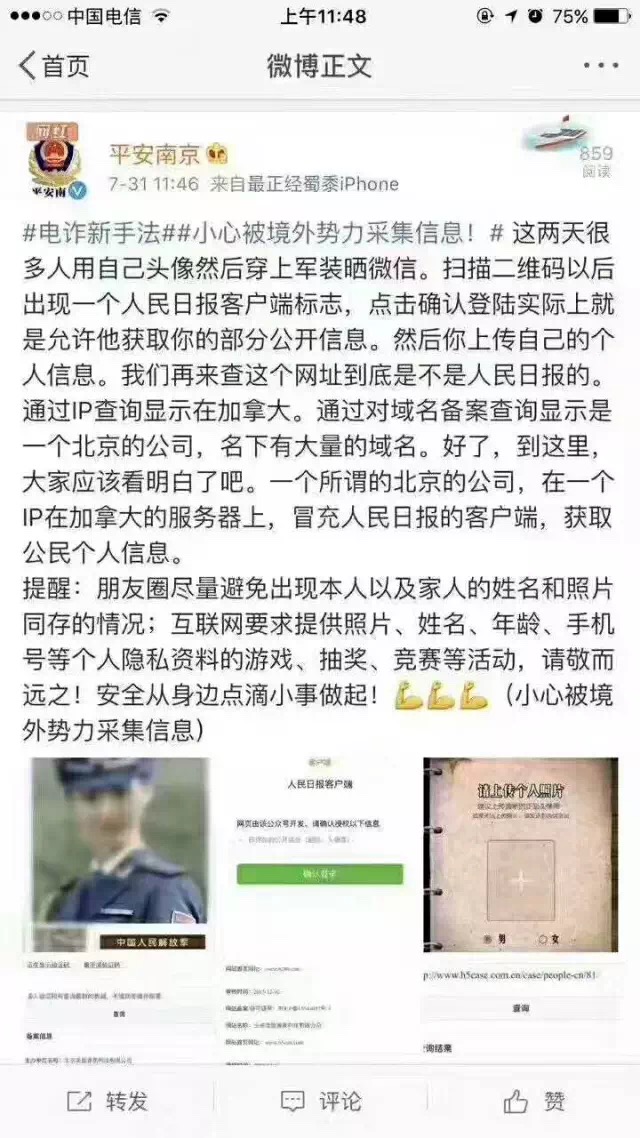 据称,“穿上军装”H5互动游戏上线两天,PV超过1.2亿,目前每分钟在线人数17万,服务器表示亚历山大。然昨日开始,剧情突变,朋友圈里传出此游戏涉嫌为 “泄露”个人隐私的“钓鱼软件”。