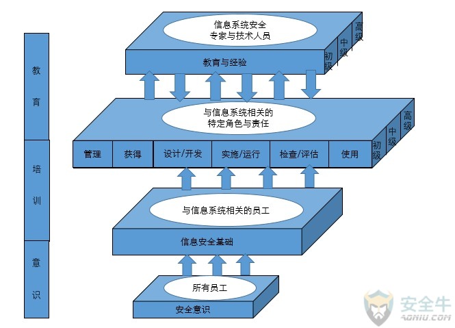 等级保护对象由原来的信息系统,调整为:安全等级保护的对象包括网络基础设施、信息系统、大数据、云计算平台、物联网、工控系统等。 等级保护相关的定级指南、测评指南、设计技术要求、测评要求、测评过程指南等相关标准也发布了相应的修订版(征求意见稿)。 2. 等级保护体系的设计 等级保护的设计分为安全策略设计、安全管理设计及安全技术设计三个方面的内容,形成信息安全保障体系的组织体系、策略体系、技术体系及运行体系。 2.1 总体安全策略设计 总体策略设计的目标是形成组织纲领性的安全策略文件,包括确定安全方针和安全策略两方面的内容。安全方针是阐明安全工作的使命和意愿,定义信息安全的总体目标,规定信息安全责任机构和职责,建立安全工作运行模式等;安全策略是说明安全工作的主要策略,包括安全组织机构划分策略、业务系统分级策略、数据信息分级策略、等级保护对象互连策略、信息流控制策略等。 通过方针与策略的设计,以便组织可以结合等级保护基本要求系列标准、行业基本要求和安全保护特殊要求,构建机构等级保护对象的安全技术体系结构和安全管理体系结构。对于新建的等级保护对象,应在立项时明确其安全保护等级,并按照相应的保护等级要求进行总体安全策略设计。 2.2 安全管理体系设计 根据等级保护基本要求系列标准、行业基本要求、安全需求分析报告等,设计等级保护对象安全管理体系框架。主要是从安全管理制度、安全管理机构、人员安全管理、系统建设管理、系统运维管理五个方面进行设计。 安全管理体系设计成果可分为四层。第一层为总体方针、安全策略,通过信息安全总体方针、安全策略明确机构信息安全工作的总体目标、范围、原则等。第二层为信息安全管理制度,通过对信息安全活动中的各类内容建立管理制度,约束信息安全相关行为。第三层为安全技术标准、操作规程,通过对管理人员或操作人员执行的日常管理行为建立操作规程,规范信息安全管理制度的具体技术实现细节。第四层为记录、表单,用于在信息安全管理制度、操作规程实施时需填写的表单和需保留的操作记录。 2.3 安全技术体系设计 根据组织总体安全策略文件、GB/T 22239、行业基本要求和安全需求,设计等级保护对象的安全技术体系架构。等级保护对象的安全技术防护体系由从外到内的“纵深防御”体系构成,首先通过“物理环境安全防护”保护服务器、网络设备以及其他设备设施免遭地震、火灾、水灾、盗窃等事故导致的破坏,然后通过“通信网络安全防护”保护暴露于外部的通信线路和通信设备,通过“网络边界安全防护”对等级保护对象实施边界安全防护,内部不同级别定级对象尽量分别部署在相应保护等级的内部安全区域,低级别定级对象部署在高等级安全区域时遵循“就高保护”原则,对于内部安全区域将实施“主机设备安全防护”和“应用和数据安全防护”,通过“安全管理中心”对整个等级保护对象实施统一的安全技术管理。 等级保护对象的安全技术体系架构见下图所示: 根据安全技术架构的设计,组织可以寻找相应的技术与产品来实施安全控制措施。安全技术与产品的选择,请参考安全调查分析机构安全牛推出的 “网络安全行业全景图”(http://all.aqniu.com/)。 网络安全全景图目前共分为17大安全领域,59个细分领域,包含约200家安全企业和相关机构,比较全面地对主流的安全技术与产品进行了介绍,可以供用户在选择技术与产品解决方案时加以参考。 3. 信息安全教育与培训 《网络安全法》第三十四条规定,关键信息基础设施的运营者还应当履行对从业人员进行网络安全教育、技术培训和技能考核的义务。 信息安全教育与培训是实施有效信息管理的重要基础,组织要周期性地进行信息安全教育与培训规划,要在员工中形成一个行之有效、常抓不懈的氛围,教育的形式既要生动有趣,又要紧凑有效。组织可以考虑采用以下NIST基于角色与职责的、框架式的安全教育模型: 组织可根据各岗位人员信息安全能力建设需求,设计未来3到5年信息安全培训规划,并针对各岗位的工作特征,制定各岗位信息安全能力需求表,以及由知识组合成的课程。根据组织的实际情况可采用以下基于角色与职责的、框架式的课程设计。以下是基于岗位与信息安全知识体对应的培训方案示例: 此外,《网络安全法》第十九条规定,“各级人民政府及其有关部门应当组织开展经常性的网络安全宣传教育,并指导、督促有关单位做好网络安全宣传教育工作。“因此,网络运营者在进行人员能力建设的同时,还应加强包括管理层在内全员网络安全意识培养和重要性宣传的工作。 普通员工是各项业务的执行者,员工信息安全意识的薄弱是组织信息安全最大的风险。内部员工无意的疏忽,往往会引发敏感信息泄露等安全事件的发生。内部员工的信息安全意识水平提升有助于减少信息安全风险,提升组织的总体信息安全水平。 组织应设计与提供贯穿员工整个职业生命周期的、多种层次、多种方式的信息安全意识宣贯,提高组织全体员工的信息安全意识水平。以下是各类信息安全意识教育形式示例: 4. 安全体系的持续改进 组织在经过合规差距分析并建成组织、管理和技术体系之后,要推进体系的运行。如果条件许可