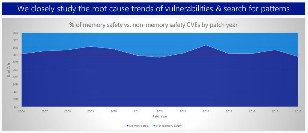 这种高百分比的原因是因为Windows主要使用C和C ++编写,这两种“内存不安全”编程语言允许开发人员对可以执行代码的内存地址进行细粒度控制。开发人员的内存管理代码中的一个漏洞可能导致大量的内存安全错误,攻击者可以利用这些漏洞进行入侵 - 如远程代码执行或特权提升等。