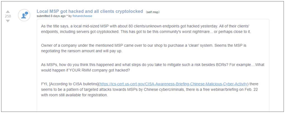 在MSP Reddit频道最近发布的一篇文章中,用户报告说黑客攻击本地MSP后分发GandCrab勒索软件。