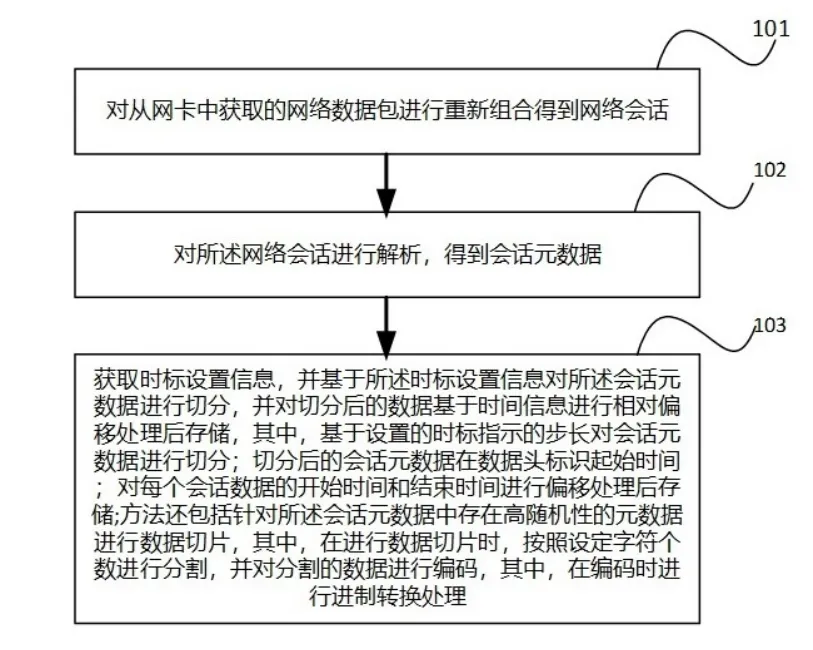 在此背景下,本发明专利创新提出了一种网络高频短会话的压缩存储方法及装置。方法包括对从网卡中获取的网络数据包进行重新组合得到网络会话;对所述网络会话进行解析,得到会话元数据;获取时标设置信息,并基于所述时标设置信息对所述会话元数据进行切分,并对切分后的数据基于时间信息进行相对偏移处理后存储,其中,基于设置的时标指示的步长对会话元数据进行切分;切分后的会话元数据在数据头标识起始时间;对每个会话数据的开始时间和结束时间进行偏移处理后存储。
