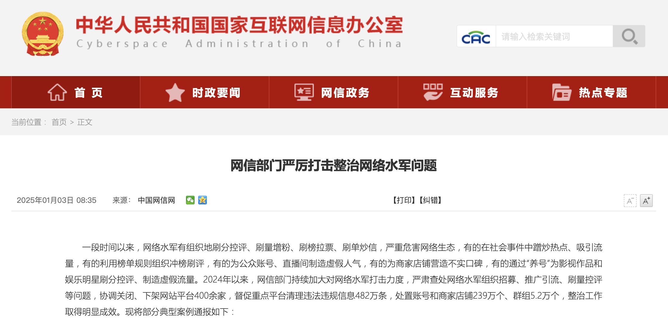 5.查处利用新技术新应用实施流量造假。一些网络水军频繁操控机器人账号在话题评论区批量发布信息,借机冲榜刷评,制造热点话题。一些软件工具开发AI写作、群控账号、批量存稿等功能一键代发帖文,为网络水军操纵账号、炮制话题提供便利。对此,网信部门已督促网站平台依法依约处置相关违规账号,配合有关部门查处AI工具水军团伙,并指导平台提升技术手段,及时拦截处置群控软件和机器人账号,有效防控问题风险。