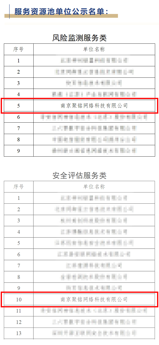 其中,聚铭网络凭借其出色的表现,成功入选“风险监测服务”与“安全评估服务”两大类别资源池名单,彰显了公司在网络安全领域的深厚底蕴和广泛认可。