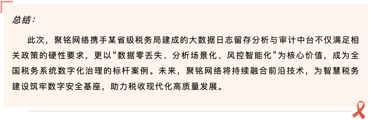 在本次项目中,该省级税务局“大数据日志留存分析与审计中台”以政策合规为根基、技术创新为引擎,成功攻克了海量日志采集难、分析弱、留存散等核心痛点,主要实现了四大核心价值突破: