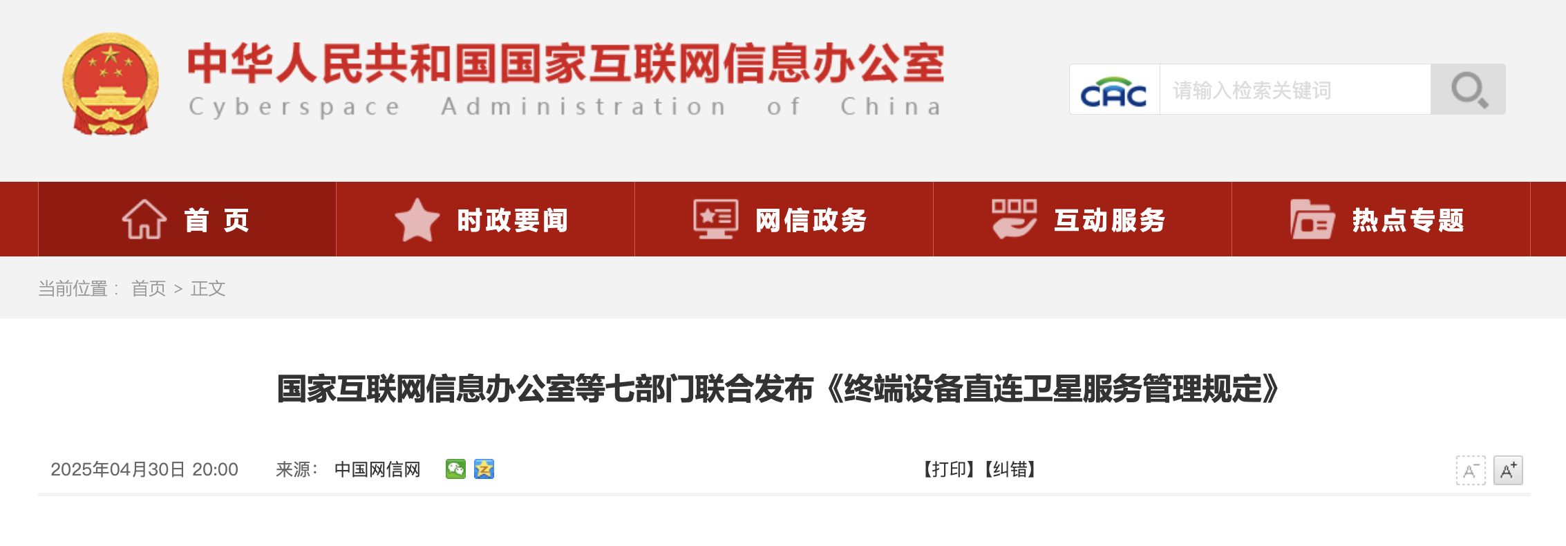 国家互联网信息办公室等七部门联合发布《终端设备直连卫星服务管理规定》 |