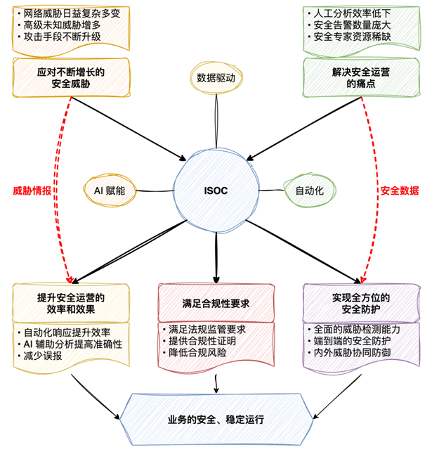 ISOC的必要性ISOC的必要性体现在能够解决传统安全运营的痛点,并在提高安全运营效率、降低运营成本的同时,提升应对日益复杂的网络安全威胁的能力,并最终实现业务的安全、稳定运行。
