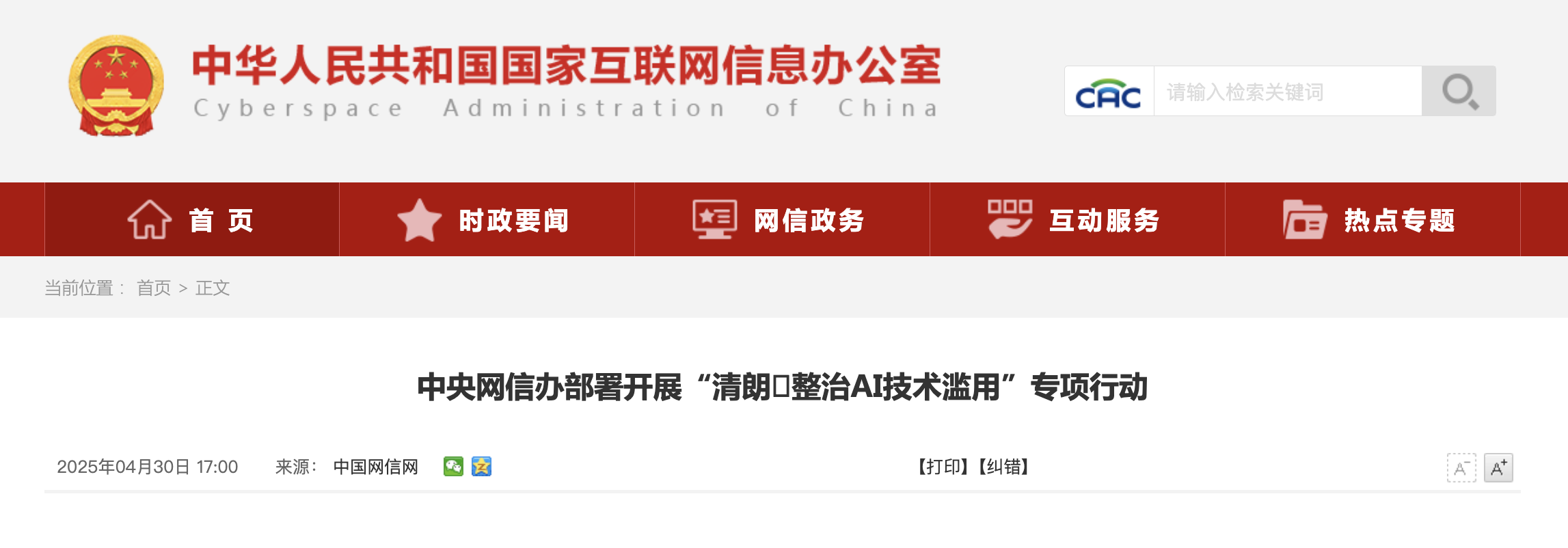 为规范AI服务和应用,促进行业健康有序发展,保障公民合法权益,近日,中央网信办印发通知,在全国范围内部署开展为期3个月的“清朗·整治AI技术滥用”专项行动。