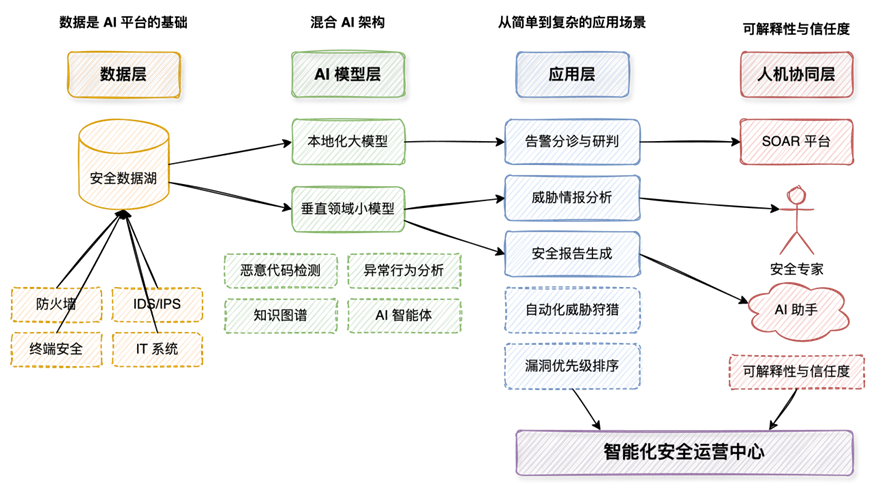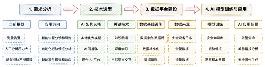 情报源接入:该能源企业首先梳理了自身需要的威胁情报类型,包括恶意IP地址、恶意域名、恶意文件哈希、漏洞信息、攻击组织信息(APT)、行业威胁情报等。然后,他们逐步接入了多个威胁情报源,如购买了某商业威胁情报、订阅了某开源威胁情报、并加入了能源行业的信息安全共享联盟,获取行业内的威胁情报,并且将安全团队在日常安全运营和事件响应流程中发现的威胁情报,也记录到威胁情报平台中,平台会自动对来自不同情报源的数据进行清洗、去重、标准化处理,将不同格式的情报数据转换为统一的格式,并提取出关键的IOC。 情报分析与评估:该能源企业的安全团队利用威胁情报平台提供的分析工具,对收集到的威胁情报进行分析与评估。如分析不同情报源之间的关联关系,例如,某个恶意IP地址是否与某个已知的攻击组织相关联。分析威胁情报的时间分布和变化趋势,了解当前的威胁。并根据威胁信息的类型、来源、可信度等因素,评估其对企业资产的潜在威胁。 情报应用:该能源企业将威胁情报与SIEM平台、SOAR平台以及防火墙、EDR等安全设备进行了集成。首先,威胁情报平台将经过处理和评估的威胁情报(例如恶意IP地址、恶意域名、恶意文件等)提供给SIEM平台。SIEM平台利用这些威胁情报,可以提升威胁检测的准确性和效率。例如,当SIEM平台检测到某个IP地址与企业内部主机通信时,会自动查询威胁情报,判断该IP地址是否为已知的恶意IP地址。其次,威胁情报平台为SOAR平台的自动化响应脚本提供威胁情报支持。例如,在处理钓鱼邮件攻击事件时,SOAR平台可以自动查询威胁情报,判断邮件中的URL或附件是否为恶意。 实际效果:在威胁情报平台投入使用后,通过与SIEM集成,威胁情报平台提供的威胁情报帮助SIEM平台更准确地识别出不良流量和不良行为,减少了误报和漏报。通过与SOAR集成,威胁情报平台为自动化响应提供了关键的威胁情报,使SOAR平台能够更快、更准确地执行响应操作。通过对威胁情报的分析,该能源企业的安全团队能够更早地了解威胁现状,并采取主动的防御措施,例如调整安全策略、加强安全监控等。基于威胁情报中丰富的威胁情报信息,安全分析师可以更有效地进行威胁狩猎,主动发现潜藏在企业网络中的威胁。 5.构建AI分析平台案例某银行构建AI分析平台案例案例概况 某银行作为一家大型金融机构,随着数字化转型的加速,其业务系统和数据资产面临着日益复杂的网络安全威胁。传统的安全运营中心(SOC)在应对海量告警、人工分析压力以及新型威胁方面逐渐显得力不从心。为了提升威胁检测和响应的效率与智能化水平,该银行决定对其现有的安全运营中心进行升级,构建一个强大的AI分析平台,以更好地应对当前的安全挑战。AI分析平台建设目标是实现智能化的告警处理、威胁情报分析和安全事件响应,从而提升整体的安全运营效率和智能化水平。