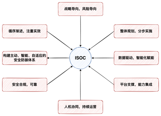ISOC建设成熟度模型 ISOC建设原则ISOC的建设是一个持续优化的过程,需要根据组织的实际情况和安全需求的变化,不断调整和完善。针对各个成熟度级提供的ISOC建设方案。组织应结合自身的实际情况,参考方案并制定切实可行的ISOC建设路线图,逐步提升自身的安全运营能力。ISOC的建设应遵循以下关键原则,以确保项目成功落地,发挥预期价值,构建主动、智能、自适应的安全防御体系。