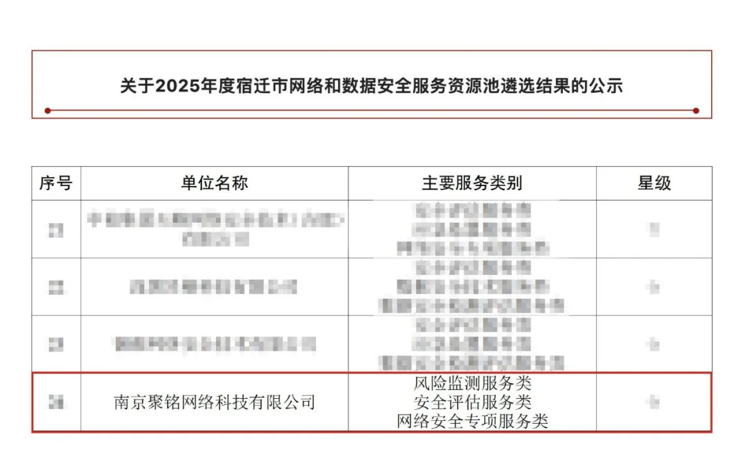 近日,宿迁市委网信办公示了2025年度宿迁市网络和数据安全服务资源池遴选结果。经过包括自主申报、资质审查及综合评议在内的多轮严格筛选,聚铭网络凭借其卓越的技术能力和深厚的专业背景成功入选。