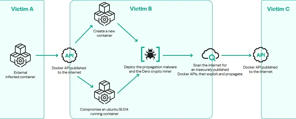 FREEBUF5月22日消息,卡巴斯基实验室发现一种新型恶意软件,专门利用暴露在互联网上的Docker容器API发起自复制式Dero加密货币挖矿攻击。该恶意软件无需依赖命令与控制服务器(C2),即可通过感染的容器自动扫描并传播到其他存在漏洞的Docker主机,形成“容器僵尸网络”。攻击主要包含两个用Go语言编写的核心组件:一是伪装成Nginx Web服务器的传播蠕虫“nginx”,负责扫描和感染;二是定制化的Dero挖矿程序“cloud”,内含加密的钱包和节点配置信息。