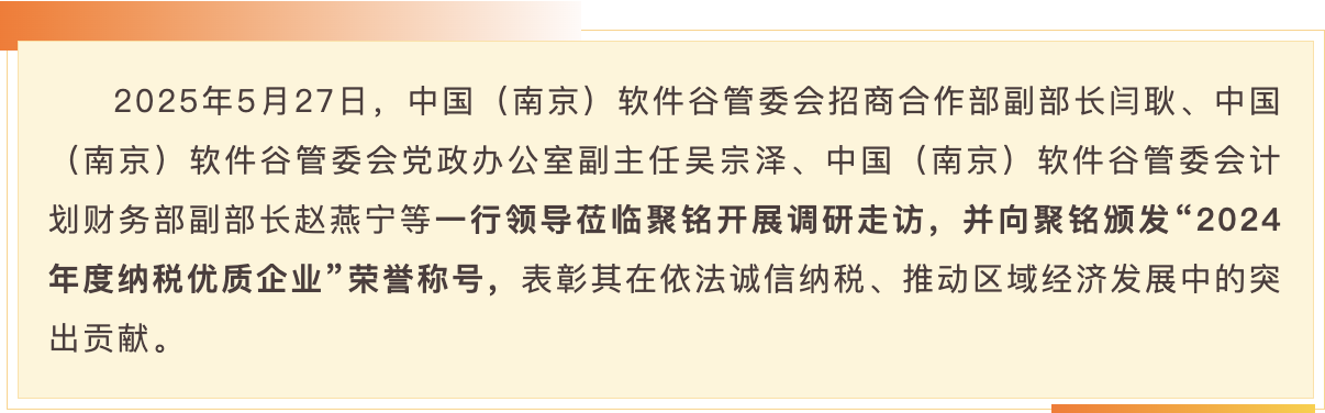自落户软件谷以来,聚铭始终依法合规经营、积极履行社会责任,连续多年获评由中共南京市雨花台区委员会、中国(南京)软件谷管理委员会及授予的各类纳税荣誉:“纳税突出贡献企业”、“重点纳税企业”、“纳税优质企业”等。此次再度荣获2024年度“纳税优质企业”,充分体现了地方政府主管部门对公司综合发展实力与社会贡献的高度认可。