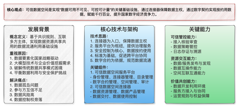 数据要素化的国家战略驱动。我国前瞻性地将数据列为继土地、劳动力、资本、技术之后的第五大生产要素,“数据二十条” 等顶层设计为数据发展绘制了宏伟蓝图,明确构建数据基础制度,全方位发挥数据要素作用,并提出了数据产权“三权分置”(即数据资源持有权、数据处理使用权、数据产品经营权)等核心制度设计理念。可信数据空间的通过连接器实现数据主权保留、通过数字合约等实现按约用数据和可控可计量,为这些要求的落地提供了基础设施的支撑。 大模型技术发展与企业价值挖掘的内在需求。随着企业数字化转型的深入,跨组织、跨系统的数据融合与协作成为提升效率、驱动创新、优化决策的必然趋势,推动了对安全可信数据流通技术的需求,如融合多方数据的反欺诈治理等业务需求。人工智能(特别是大模型)的快速发展,对海量、高质量、多样化的训练数据提出了迫切需求,而这些数据往往分散在不同主体手中,需要在保障安全和隐私的前提下进行流通和利用。 破解传统数据共享模式的困境。我国目前数据共享模式面临“数据孤岛”、参与各方互信不足、数据风险高,以及数据控制权失控等核心痛点,都严重削弱了数据潜力的发挥和数据价值的释放。可信数据空间通过建立一套参与方共同认可的技术标准、治理规则和运营机制,在互不完全信任的参与方之间构建一个相对可信的数据协作环境,促进数据流通,激活数据要素价值。 平衡数据利用与安全保护的现实挑战。随着《数据安全法》、《个人信息保护法》等法规的深入实施,如何在保障数据安全和个人隐私的前提下,合规、高效地利用数据,成为所有市场主体面临的共同挑战。可信数据空间制度通过隐私计算等技术创新,实现“原始数据无域、数据可用不可见、数据可控可计量”的目标。 1.关键能力可信数据空间通过整合先进的安全技术、标准化的接口与协议,以及明确的各项治理规则与运营机制,构建安全、合规地进行数据共享、融合计算和价值共创的生态空间系统。可信数据保障空间应具备可信管控能力、资源交互能力和价值共创能力,支撑其“可连接、可管控、可共创”的目标。 可信管控能力可信管控能力是可信数据空间的基石,确保数据流通利用过程的安全、合规与可信。通过对接入身份的核验审查、数据策略管控和审计溯源实现。