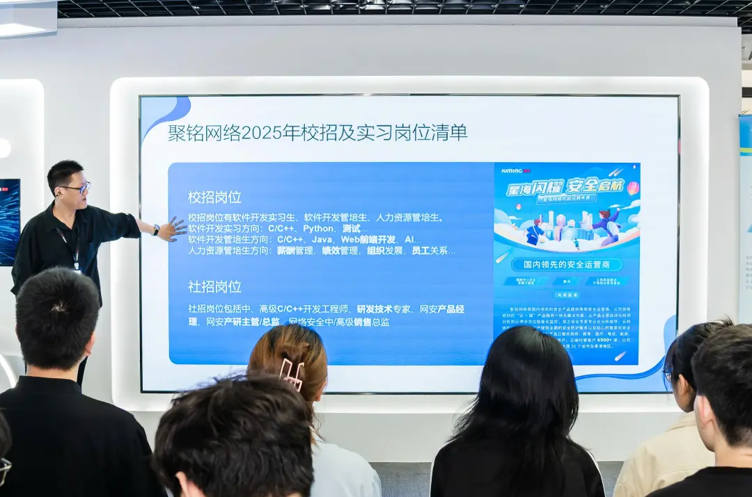 在随后的圆桌对话中,聚铭HR与技术骨干围绕“校园到职场的过渡”展开深度分享,从职业规划方法论到就业新路径解析,从应届生就业形势分析到岗位能力模型解读,详细介绍了网络安全工程师、数据安全分析师等热门岗位的晋升通道。并同步分享了 2025 年聚铭校招及实习岗位清单,旨在为学子们提供清晰的求职方向。