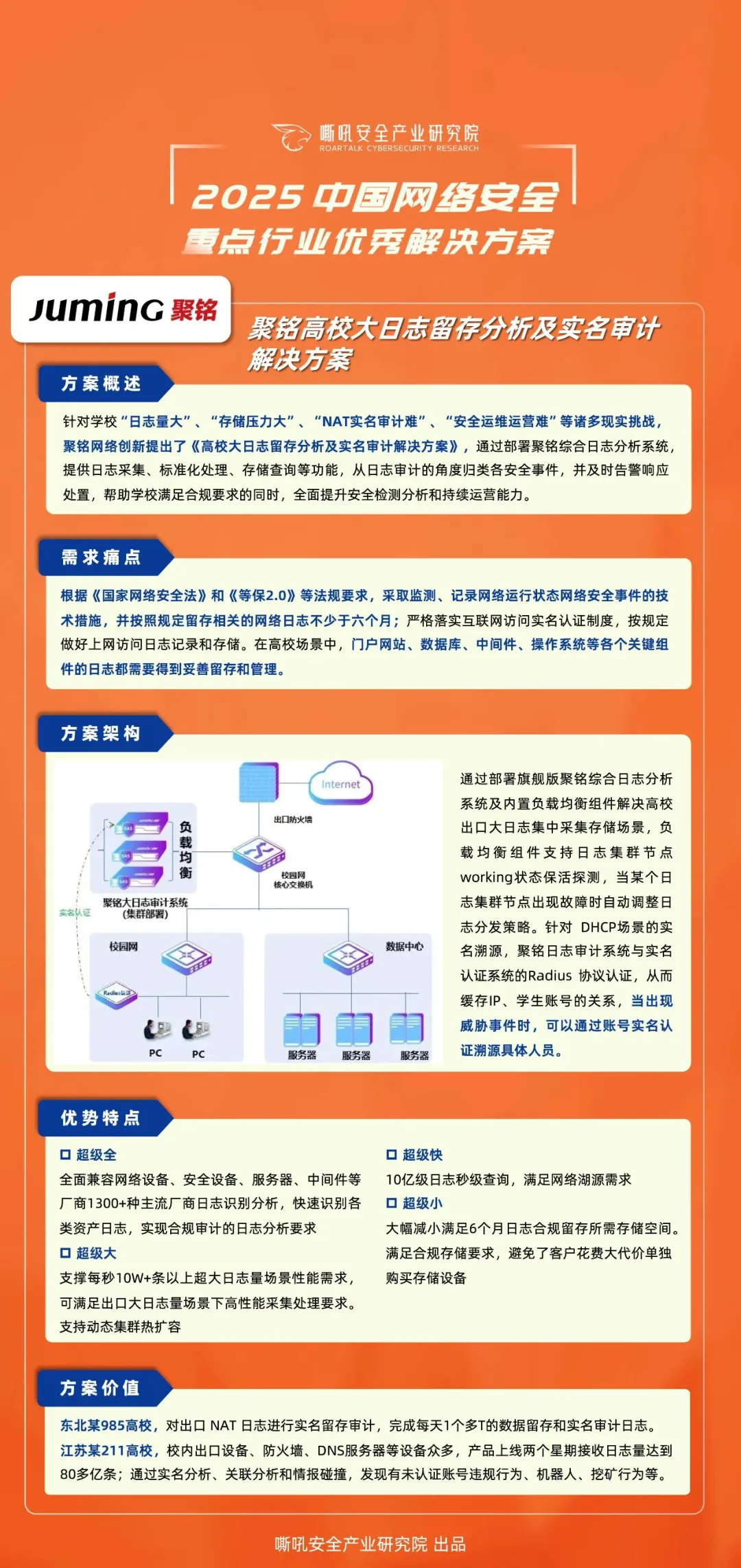 近日,嘶吼安全产业研究院正式发布《2025中国网络安全重点行业优秀解决方案》,聚铭网络「高校大日志留存分析及实名审计解决方案」从众多参选方案中脱颖而出,获评“教育行业优秀解决方案”,以硬核实力引领行业赛道。