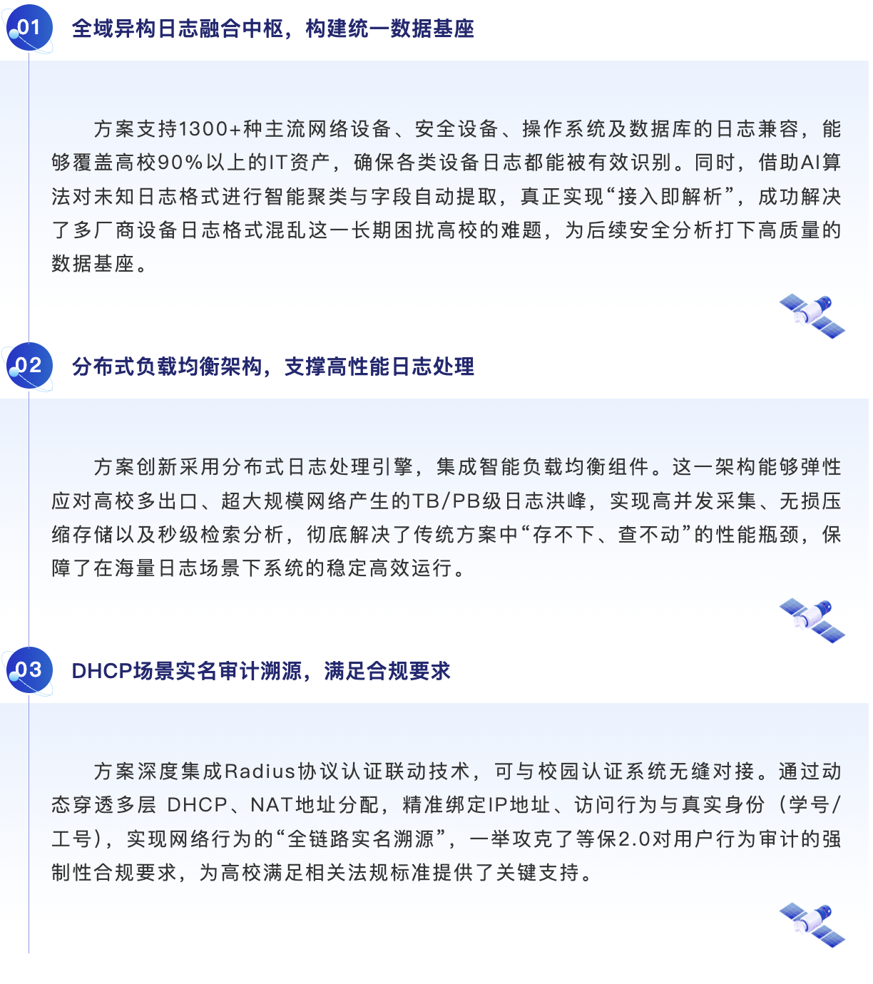 在此背景下,高校面临诸多挑战,海量日志集中管理困难、行为溯源效率低下、合规审计压力加剧等问题日益突出。聚铭网络的解决方案正是针对这些痛点而设计,提供了一套精准、高效的应对策略。