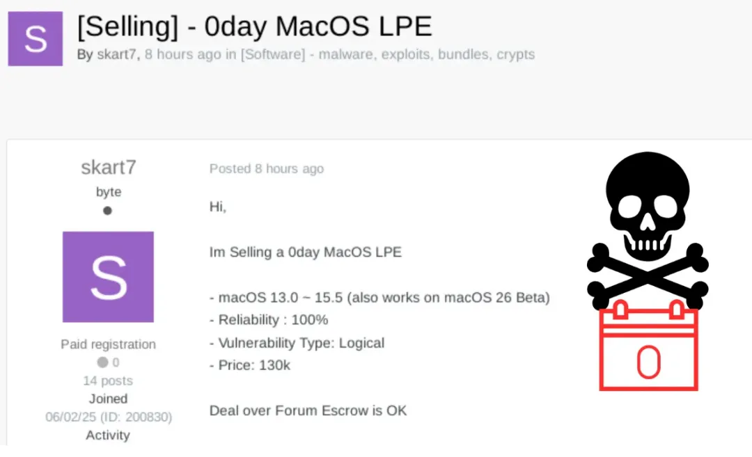 近日,代号为“skart7”的黑客在黑客论坛兜售针对苹果macOS操作系统的零日本地提权漏洞(LPE),这一消息引发了macOS用户尤其是企业和高价值目标组织的高度警惕。