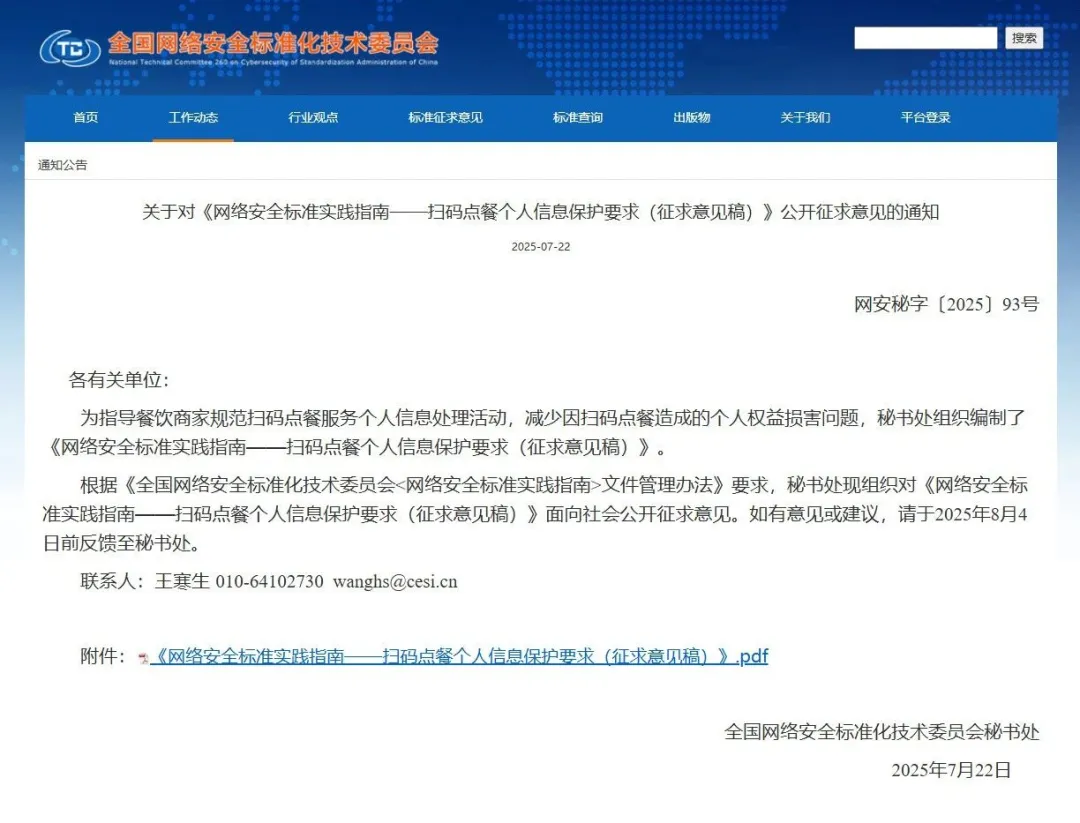 关于对《网络安全标准实践指南——扫码点餐个人信息保护要求(征求意见稿)》公开征求意见的通知