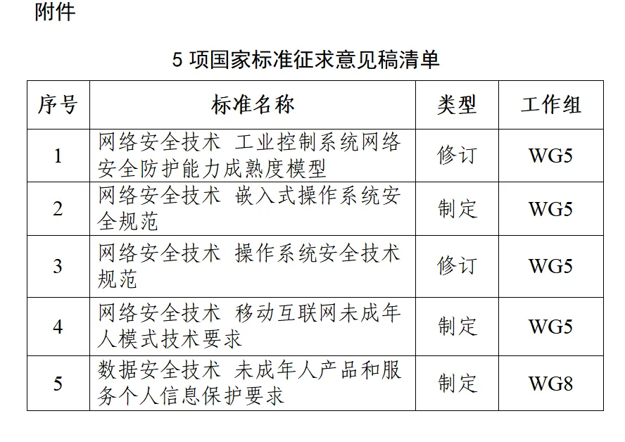 1、《网络安全技术 工业控制系统网络安全防护能力成熟度模型》等5项国家标准公开征求意见