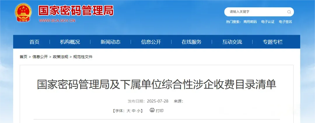 消息来源:国家密码管理局 国密局发布商密检测认证中心综合性涉企收费目录清单!