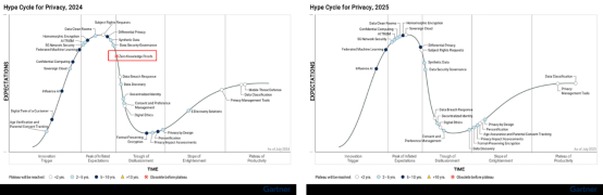 24身份与隐私的关系 隐私保护(Privacy Protection) 作为一个安全专项,涉及的细分技术类型较多。Gartner采用《Hype Cycle for Privacy》技术曲线对其技术演进进行追踪。对比2024年,2025年曲线上出现了两个集中点:一部分相对新兴的技术集中到达了“膨胀周期”的顶端;另一部分发展较早的技术开始集中越过了“幻灭周期”的谷底,进入爬升阶段;此外,个别技术由于种种原因被取消跟踪,如ZKP、SMPC。目前整体到达成熟期的技术寥寥无几。 这一趋势一方面反映了隐私技术正处于密集发展、持续更迭的快速动态变化之中;同时也反映出行业对隐私的高度关注和技术成熟度不足之间的反差。其背后即包含了新技术之间的边界扩张与合规压力的持续增强,形成了对隐私保护能力的“刚性需求”;也包括产业落地、公众关注和风险演化的不断挑战,推动了隐私技术持续演进与多元化发展。