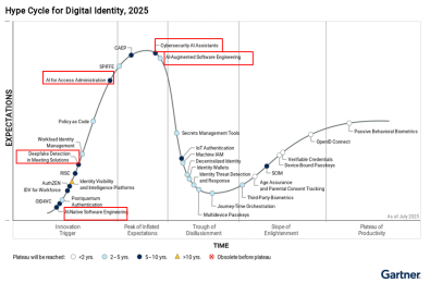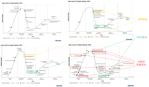 但随着技术发展,生物识别伪造、生成式AI技术,可模仿企业IT支持、银行客户,欺骗用户在错误网站使用FIDO认证。如何保证生物识别+用户行为验证不被AI模拟,从而维持FIDO的抗钓鱼、抗冒用优势,即将成为一项新技术挑战。 二、AI驱动的身份安全和管理技术随着AI技术的广泛渗透,“AI赋能数字身份”正在成为数字身份管理的重要发展方向。从Gartner近三年数字身份技术成熟度曲线中可以看到,自2024年开始,在不断迭代AI驱动的新兴技术,如:AI增强软件工程、网络安全AI助手、Deepfake检测、AI访问管理、AI原生软件工程、身份可视化与智能平台。其中,AI增强、AI助手、AI原生及AI访问管理的目标是使数字身份治理更加自动化和智能化,Deepfake检测是应对“深度伪造攻击”。