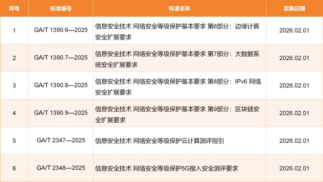 近日,涵盖边缘计算、大数据、IPv6、区块链、云计算及5G接入安全领域的六项网络安全等级保护公安行业标准正式发布,并于2026年2月1日起正式实施。这些标准聚焦新技术领域安全痛点,从安全扩展要求、测评扩展要求等维度进一步完善我国网络安全等级保护标准体系,为新技术场景下的安全防护提供技术指引。