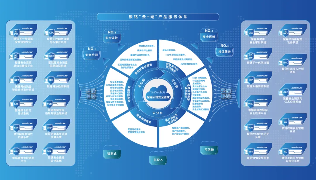 作为国内领先的安全运营商,聚铭网络始终聚焦客户安全需求,深耕网络安全领域,为客户提供全生命周期的网络安全解决方案与专业服务。公司构建了完备的“云+端”一体化产品服务体系,全面覆盖安全托管、安全管理、安全审计等核心场景,可在资产运维、漏洞识别与治理、合规监管等关键环节提供高效支撑,实现客户资产安全的全方位管控与持续优化。