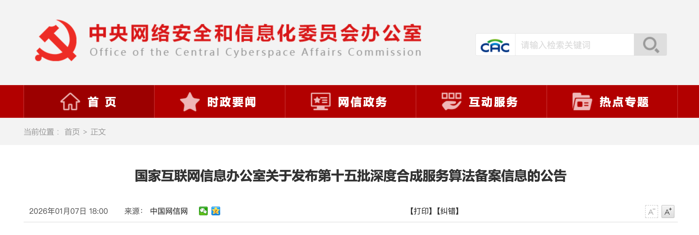 国家互联网信息办公室关于发布第十五批深度合成服务算法备案信息的公告 |