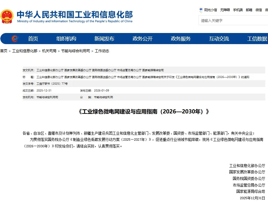 近日,工业和信息化部、国家发展改革委、国务院国资委、市场监管总局、国家能源局等五部门联合印发《工业绿色微电网建设与应用指南(2026—2030年)》(工信厅联节〔2025〕77号),引导工业企业和园区推进工业绿色微电网建设与应用,扩大工业领域绿电应用,促进工业重点行业领域节能降碳。