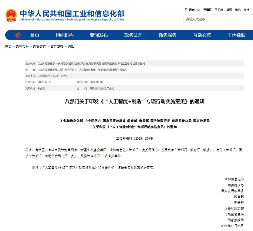 近日,工业和信息化部、中央网信办、国家发展改革委、教育部、商务部、国务院国资委、市场监管总局、国家数据局等八部门联合印发《“人工智能+制造”专项行动实施意见》(以下简称《意见》)。