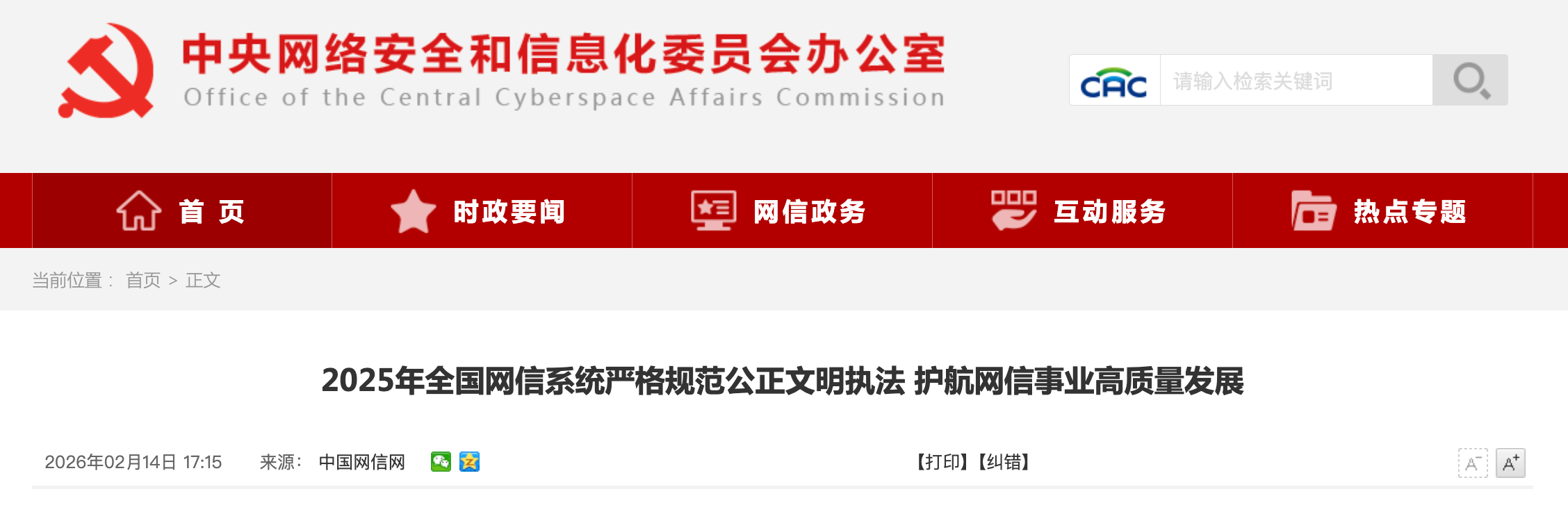 信息来源:中央网络安全和信息化委员办公室 https://www.cac.gov.cn/2026-02/14/c_1772800146205770.htm