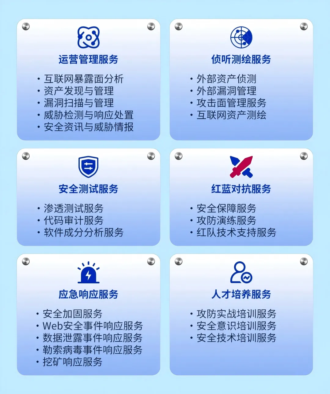 聚铭网络打造了成熟的MSS安全服务体系,涵盖运营管理、侦听测绘、安全测试、红蓝对抗、应急响应、人才培养六大类安全服务。通过整合安全专家、平台工具及标准化服务流程,为处于不同安全建设阶段的组织提供全生命周期的安全保障。