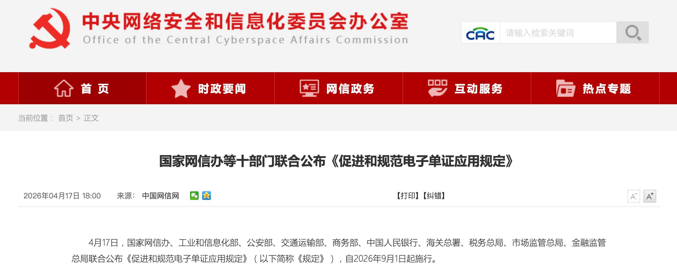 4月17日,国家网信办、工业和信息化部、公安部、交通运输部、商务部、中国人民银行、海关总署、税务总局、市场监管总局、金融监管总局联合公布《促进和规范电子单证应用规定》(以下简称《规定》),自2026年9月1日起施行。