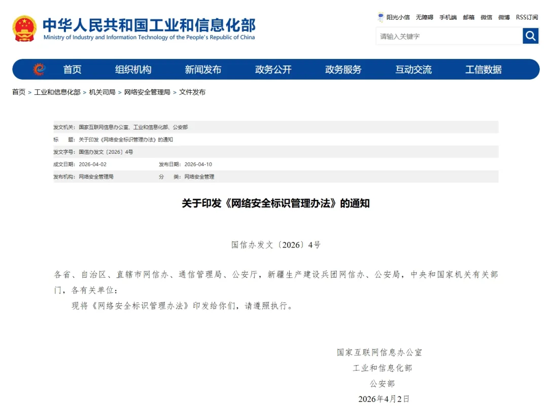 2026年4月2日,国家互联网信息办公室、工业和信息化部、公安部联合印发《网络安全标识管理办法》(国信办发文〔2026〕4号),该办法将于2026年7月1日起正式施行。