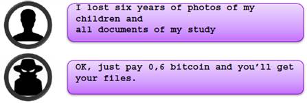 黑客攻破主机,通常会加密锁定用户的关键文件、文件夹等(比如Windows的用户目录、My Documents、相片、工作有关的docx/xlsx等),让受害者不能访问,并向受害者发出或者留下勒索信息,勒索的赎金通常通过比特币来支付,通常是半个到1个比特币。从调研数据来看,接近一半的受害者会支付赎金想要恢复数据,但不幸的是四分之一的受害者依然得不到恢复——“付赎金,依然被撕票”。