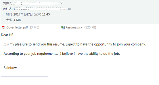 “ GoldenEye ”是勒索软件 Petya 的一个变种系列,恶意宏代码可执行、加密计算机上的文件。加密完成后,代码会修改主引导记录( MBR ),重新启动电脑并加密磁盘文件。此类钓鱼邮件专门针对人力资源部门,HR需要大量打开陌生人的电子邮件和附件去了解求职者情况的特性就让不法分子钻了空子,,