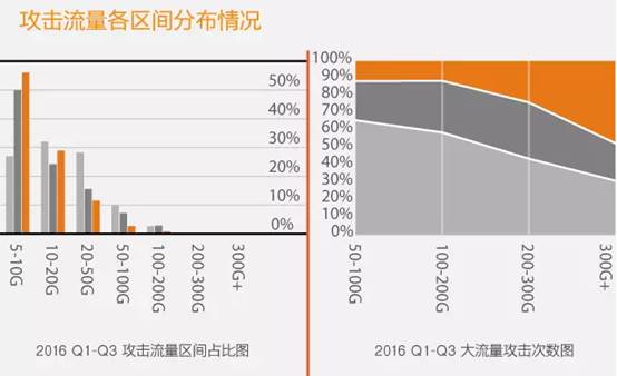 我们找了另外一家知名抗DDOS厂商最近发布的DDOS报告供大家参考,我们可以从防护的角度来看DDOS攻击。从下图的统计中发现百分九十以上的大流量DDOS攻击低于50G,而高于100G的DDOS攻击寥寥无几。
