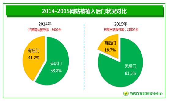 由于特殊原因本次《报告》未统计网站后门情况,为了让大家更完整的了解网站安全威胁情况,我们翻出了2015年的《中国网站安全报告》来参考。从2015年的《报告》中可以看出很大比例的网站被黑客留下了后门程序,这些后门程序主要包括ASP木马、JSP木马、PHP木马、一句话木马等WebShell木马后门,攻击者可以通过木马后门控制网站服务器甚至可以以网站服务器为跳板继续对内部网络进行渗透入侵。