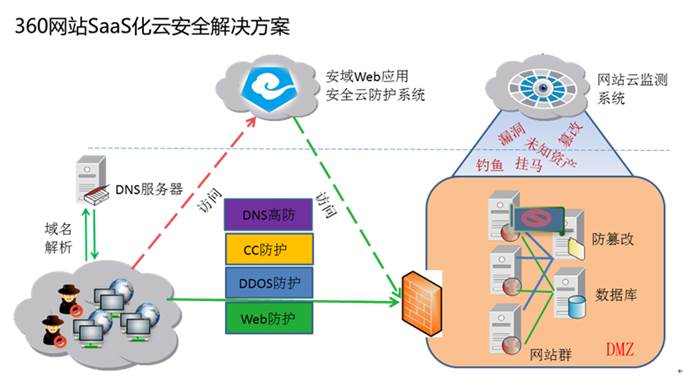 360以保护国内网站安全为己任,从2011年起分别推出了360网站安全云防护系统网站卫士和360网站安全检测系统,并永久免费,此两套系统至今已成为国内最大的网站安全防护和漏洞检测系统。无论是技术先进性、网站安全防护经验和用户数量国内没有其他厂商可以与之匹敌,说其中国网站安全的基石,实至名归。360于2014年推出了面向企业网站安全防护的360安域Web应用安全云防护系统(以下简称安域)和360网站云监测系统为企业用户提供Web安全服务。相对于免费版,企业版网站防护功能更加全面,防护能力更强,同时提供7*24小时的企业级支撑服务。 360在Web安全方面以云防护服务为核心,以云检测和云监测服务为辅助,为用户网站在云端提供事前扫描+事中防护+事后监测的全方位的网站安全服务。