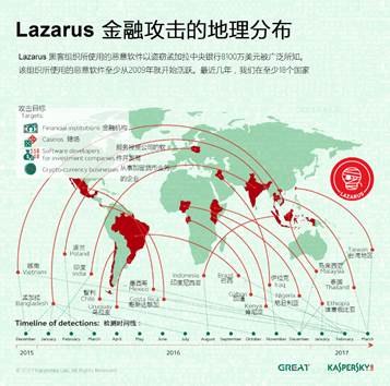 根据卡巴斯基实验室记录,从2015年12月开始,同Lazarus黑客组织活动相关的恶意软件样本出现在众多国家的金融机构、为投资公司开发赌场软件的开发商以及加密货币企业。其中包括韩国、孟加拉、印度、越南、印度尼西亚、哥斯达黎加、马来西亚、波兰、伊拉克、埃塞俄比亚、肯尼亚、尼日利亚、乌拉圭、加蓬、泰国和其它国家。卡巴斯基实验室发现的最新样本于2017年3月被检测到,表明攻击者根本没有停止攻击的打算。