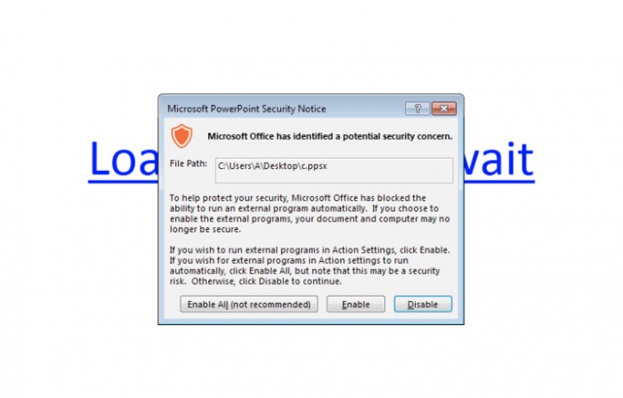 更为重要的的是,该恶意软件并非通过宏或者其他脚本等传统方式来感染系统,相反而是通过隐藏在PowerPoint文件中。当用户打开该文档,会在幻灯片中看到“Loading…Please Wait”的字样,当用户光标移动到超链接上面,即使用户没有点击,也会触发文件中包含的PowerShell代码。