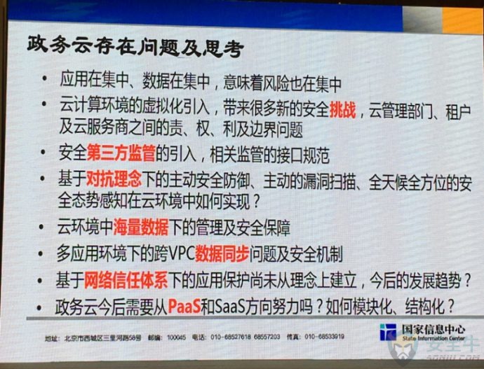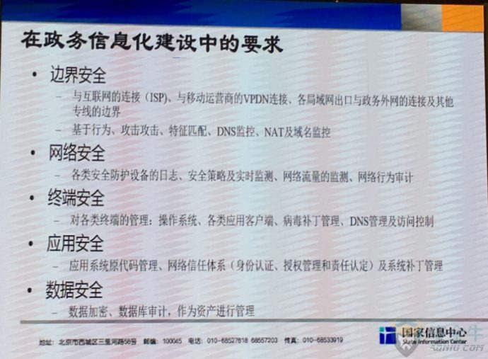 除此以外,还在遵循国家标准、参考国际相关标准的基础上,编写了《政务云安全要求》,规定了各级政府部门在使用电子云计算开展点在政务过程中应遵循的安全要求,并在今年2月份通过了专家评审。