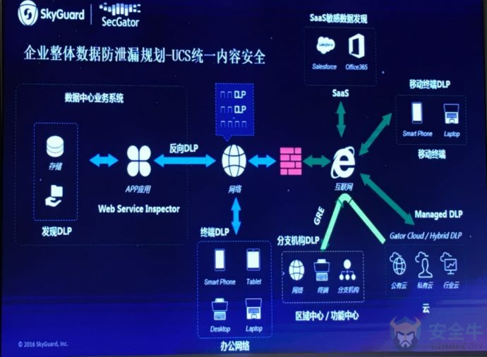 据主打统一内容安全(UCS)这一理念的天空卫士合伙人杨明非介绍,UCS包括web/邮件安全网关、数据防泄漏(DLP)、云的安全接入和移动安全等领域,而其数据保护部分的核心便是DLP产品。