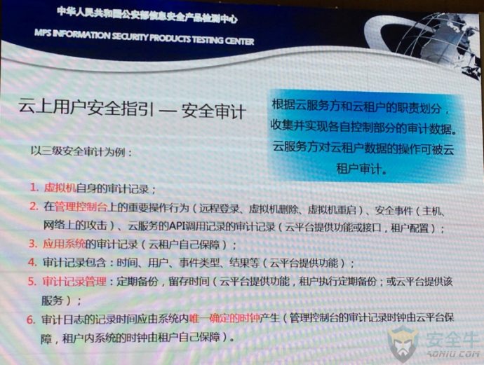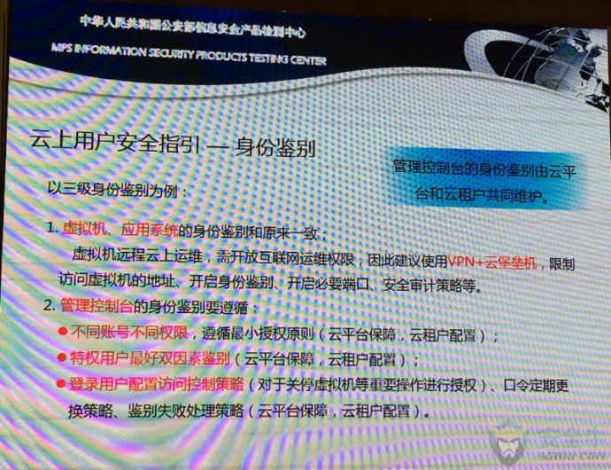 陈妍还针对云上用户分别给出了身份鉴别、安全审计、入侵防范和云服务商选择的安全指引。