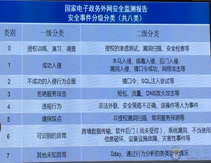 在政务外网的统一安全策略方面,采取了包括公网地址私用、全骨干网等保三级保护、统一的安全监测和网络信任体系、可信的互联网接入和减少各级政务部门的互联网出口等措施。同时,将可能的安全事件进行分级分类,包括8个一级分类和近30余项的二级分类。