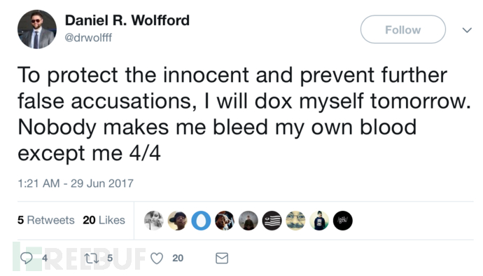 值得一提的是,国外媒体Bleeping Computer在报道中提到,名为 @drwolfff 的Twitter用户表示他就是Shadow Brokers在文中提到的人,不过他说他根本就不是NSA雇员,只不过的确为NSA制造了一些工具。他认为Shadow Brokers肯定是搞错了,最终可能导致无辜的人被牵扯进来。