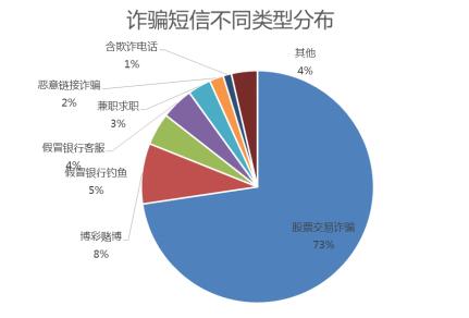 此外,据报告数据显示,2017年上半年的诈骗短信内容中,股票交易诈骗占73%,8%为赌博欺诈,假冒银行钓鱼和客服诈骗也较多,分别占到了5%和4%,之后便是兼职求职的诈骗短信。