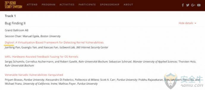 那么,如何才能又快又多地发现系统漏洞呢?在8月16日——18日召开的USENIX Security会议上,360冰刃实验室将会带来《Digtool:A Virtualization-Based Framework for Detecting Kernel Vulnerabilities》的议题分享,介绍四种类型的Windows漏洞自动挖掘技术。