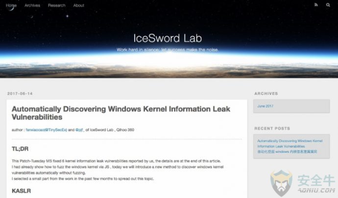 注:360冰刃实验室(IceSword Lab)是PC与移动内核的研发实验室,研究方向是PC与移动操作系统内核、安全技术以及虚拟化技术。